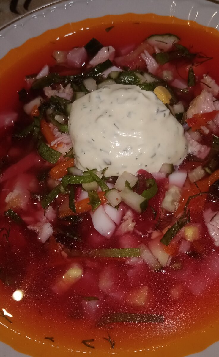 Рецепт из глубинки пошаговый с фото Я долго не решалась приготовить свекольник (ещё его называют холодник) и вот перечитав и пересмотрев множество рецептов, я решила создать свой , от которого в восторге вся наша семья. Его можно есть как тёплым, так и холодным. Уж очень он вкусный! Для этого вкуснейшего летнего супчик нам понадобится: Куриное филе 300 гр Ветчина 300 гр Свежие огурцы 2 шт Отварное яйцо 6 шт Отварной картофель 4 шт Свёкла 2 шт Морковь Зелень (зелёный лук, щавель, укроп, базилик) Соль, перец, Сахар 1 ст. ложка без горки Лимонный сок 1 ст. ложка Для соуса: Майонез, сметана, горчица, базилик, укроп, чеснок Для начала наливаем в кастрюлю воду и отвариваем в ней почищенную свёклу, добавив сахар, лимонный сок, соль и перец, морковь и куриное филе. Затем достаём и остужаем. Делаем соус, добавляем в емкость: Соус подаём порционно в каждую тарелку. Приятного аппетита! Попробуйте обязательно приготовить по этому рецепту!