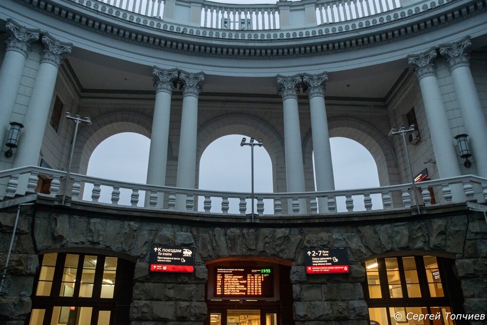 Огромные колонны на улице. Красивая и мощная лепнина в залах ожидания. Арки. Уютный дворик перед тоннелем – переходом к поездам дальнего следования. Красивые деревянные скамейки второго этажа здания в зале ожидания. Стилизованы под аквариумы с цветами есть и на первом этаже рядом с кассами.