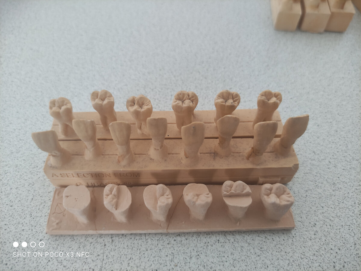 Для развития эстетического чувства у зубного техника, совершенствования его навыков и закрепления знаний по анатомии зубов начинать моделирование зубов необходимо на гипсовых моделях .Методика моделирования зубов из гипсовых блоков состоит в следующем . Приготовив гипсовый блок прямоугольной формы, измеряют штангенциркулем коронковую часть зуба в различных ее участках и направлениях {высоту коронки, ширину, толщину), и все эти данные, увеличенные в 3 раза, переносят на соответствующие поверхности гипсового блока. Соединив точки карандашом, получают очертания коронки зуба и приступают к моделированию. Более простыми словами Карвинг это- морфология, изучение формы анатомии зубов, гипс он твердый имитирует керамику,и навыки срезания нужны для того чтобы на керамике (спиливать лишнее ) , контурировать, создавать конечную форму, керамика при обжиге дает усадку,плывет ее утягивает и как бы ты не старался идеально выложить форму после обжига выходит другая картина и приходиться накладывать ма