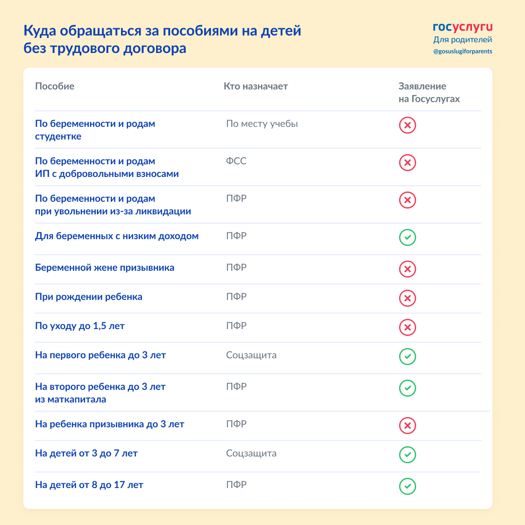 Родители без официального трудоустройства могут получать выплаты на детей — с периода беременности до 17-летия ребенка. Суммы и порядок назначения отличаются от тех, что назначаются работающим мамам и папам. В этой карточке — список ведомств и отметки о наличии онлайн-сервиса на Госуслугах. Больше информации о господдержке: 🔸 если есть трудовой договор 🔸 до 3-летия ребенка 🔸 на открытие бизнеса 🔸 при беременности 🔸 через онлайн-сервисы 🔸 для обучения 🔸 с 1 июня 2022 года