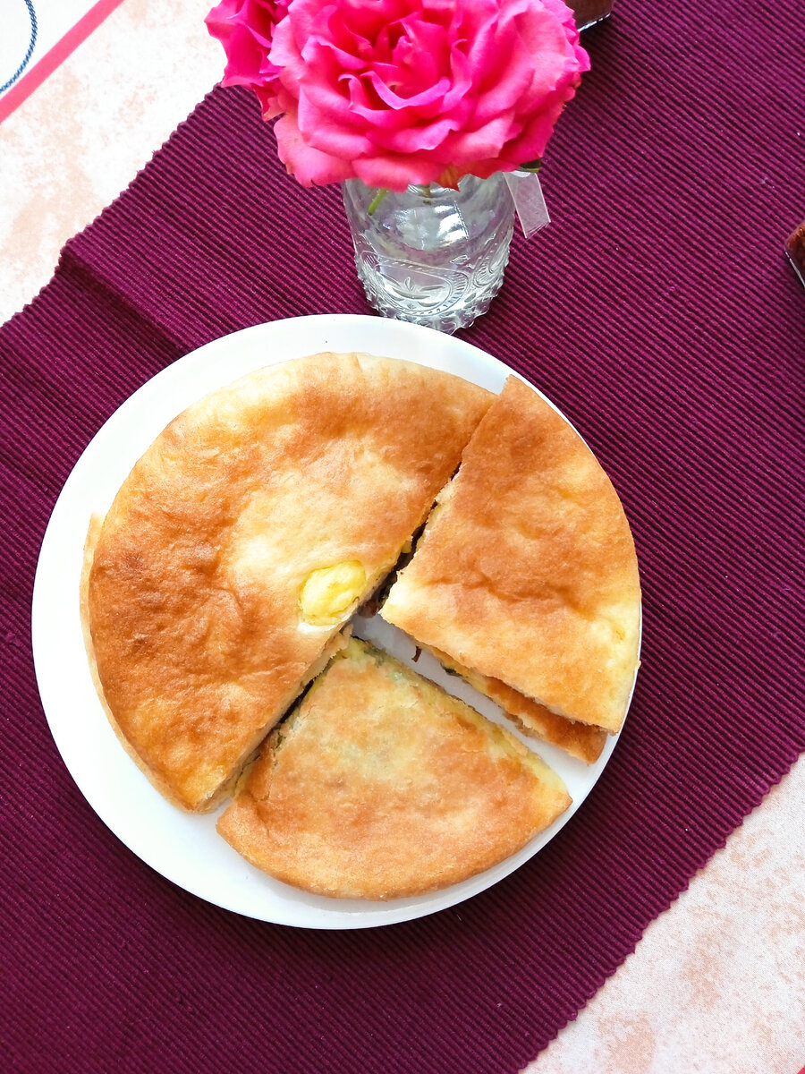 Вкусные осетинские пироги с картошкой и сыром – мягкое, воздушное и тонкое тесто с большим количеством начинки. Такие пироги знают и любят всё😍.Рецепт старалась приблизить к оригиналу, получилось вкусно! Главное не торопиться, и у вас тоже получится🤗 Мука – 400-450 г Молоко – 300 мл Дрожжи сухие – 5 г Соль – ¼ ч. л. Сахар – 1 ч. л. Масло растительное – 35 мл Картофель – 300 г Сыр сулугуни (адыгейский) – 250 г Масло сливочное – 20 г Как приготовить осетинские пироги с сыром и картофелем: 1) Смешать дрожжи, сахар и 5-7 ст. л. муки, залить теплым молоком. 2) Оставить на 30 минут, накрыв пленкой. Затем добавить соль, муку и растительное масло.Замесить мягкое и слегка липкое тесто.Накрыть пищевой пленкой и дать подойти, оставив на 40-60 минут. 3) Сварить картофель, растолочь с добавлением картофельного отвара или горячего молока. 4)Смешать картофельное пюре с натертым сыром. Дать остыть. 5)Разделить тесто на 3 части, скатать шарики и оставить на 5 минут под пленкой. Так с