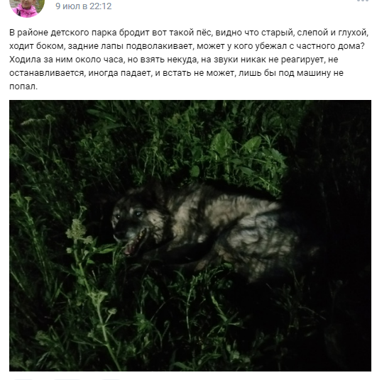 История, о которой пойдет речь, началась несколько дней назад. В городской группе появился пост о замеченном старом псе, одиноко ковылявшем по обочине дороги. Сразу замечу, никаких сообщений о розыске старичка не было нигде. Как обычно, те, кто нашел пса, ничем ему помочь не могли. Пока искали для него передержку, пока искали хозяев, пес пропал. Через день нашли хозяев, да-да, пес то, оказывается, был домашним. Хозяева оставили номер телефона, вдруг пса еще кто-то увидит. И вот, ранним утром приходит сообщение о том, что на одной из центральных улиц на обочине лежит собака в луже крови. И снова, как обычно "помогите срочно, очень жалко собаку, но ничем помочь не можем, а вы спасите ее". Чуть позже пост появился и в городской группе. И пока несколько сердобольных (скорее просто любопытных) интересовались, что с собачкой, где собачка, а много ли крови и т.д., наша волонтер просто подъехала, погрузила собаку в машину и срочно отправилась в соседний город в круглосуточную клинику.