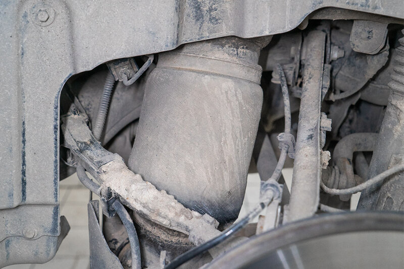 На фотографиях можно увидеть состояние задних пневматических элементов до начала работ. Так выглядели пневмобаллоны с левой стороны оси. С правой стороны оси аналогичная ситуация, корпус пневмобаллона поврежден. В и
