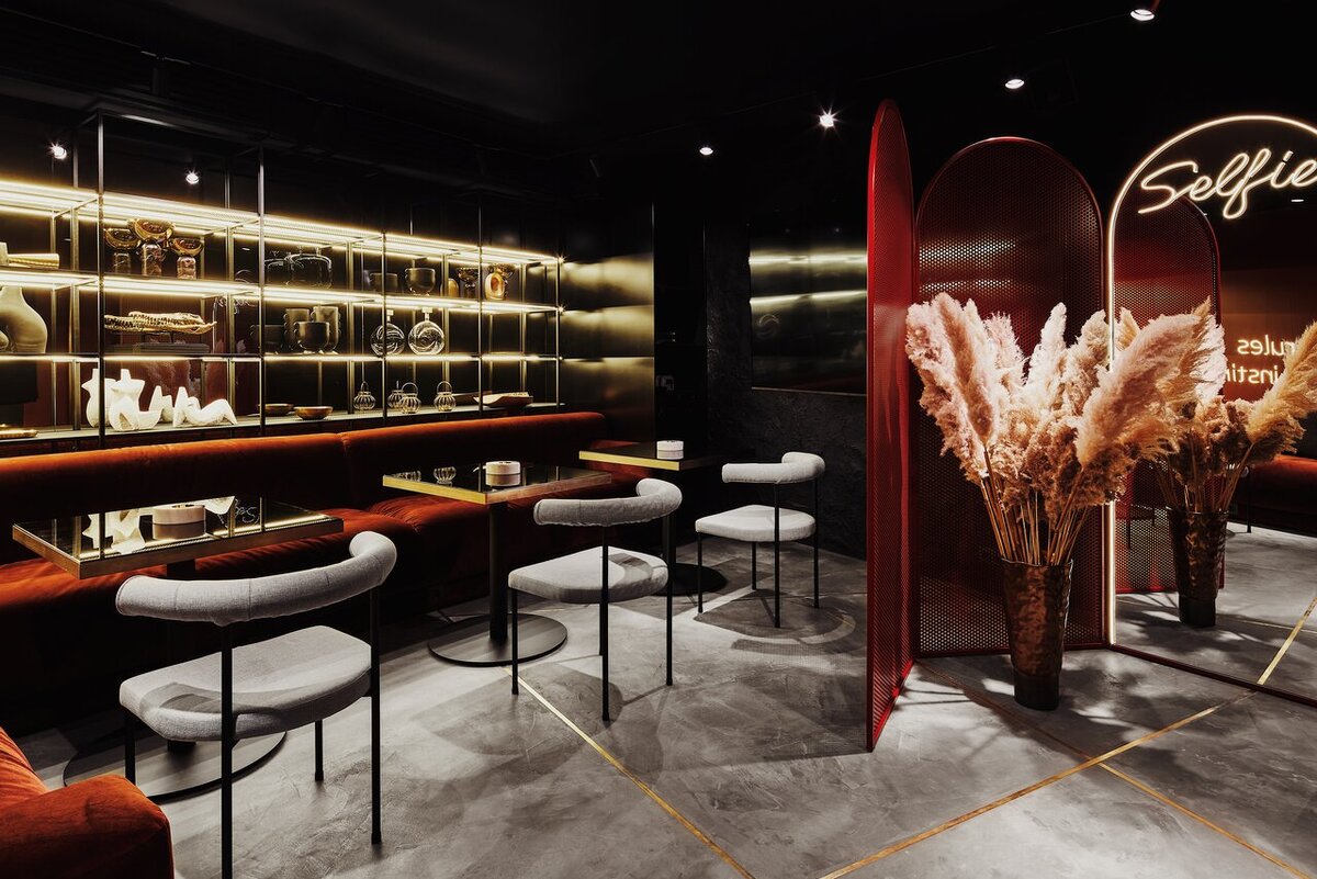 Как и в любом заведении одну из главных ролей в калянных занимает дизайн. Выбор дизайнера это всегда не простое и долгое занятие, ведь все такие разные, у всех своё видение и свои «фишки». Как вы можете заметить, дизайн-проект этого заведения отличается своими нестандартными изделиями и к этому, приложила руку одна из топовых дизайнеров Алина Цауни. Пожалуй начнём с круглой подвесной конструкции выполненной из металлокаркаса, состоящей из трёх составных частей, находящейся над Chef’s Table основного зала. В заполнение было использованному рифлёное стекло «Мору», гнутое по радиусу металлоконструкции. Для придания общего стиля заведения, было принято решение на стёкла с тыльной стороны наклеить декоративную пленку. Нижнюю часть конструкции закрыли перфорированным металлическим листом, вырезали его лазером по радиусу конструкции, и у нас получилась полка для элементов интерьера и не только. Во избежания падений предметов с полки по всему периметру был установлен латунный пруток диаметро