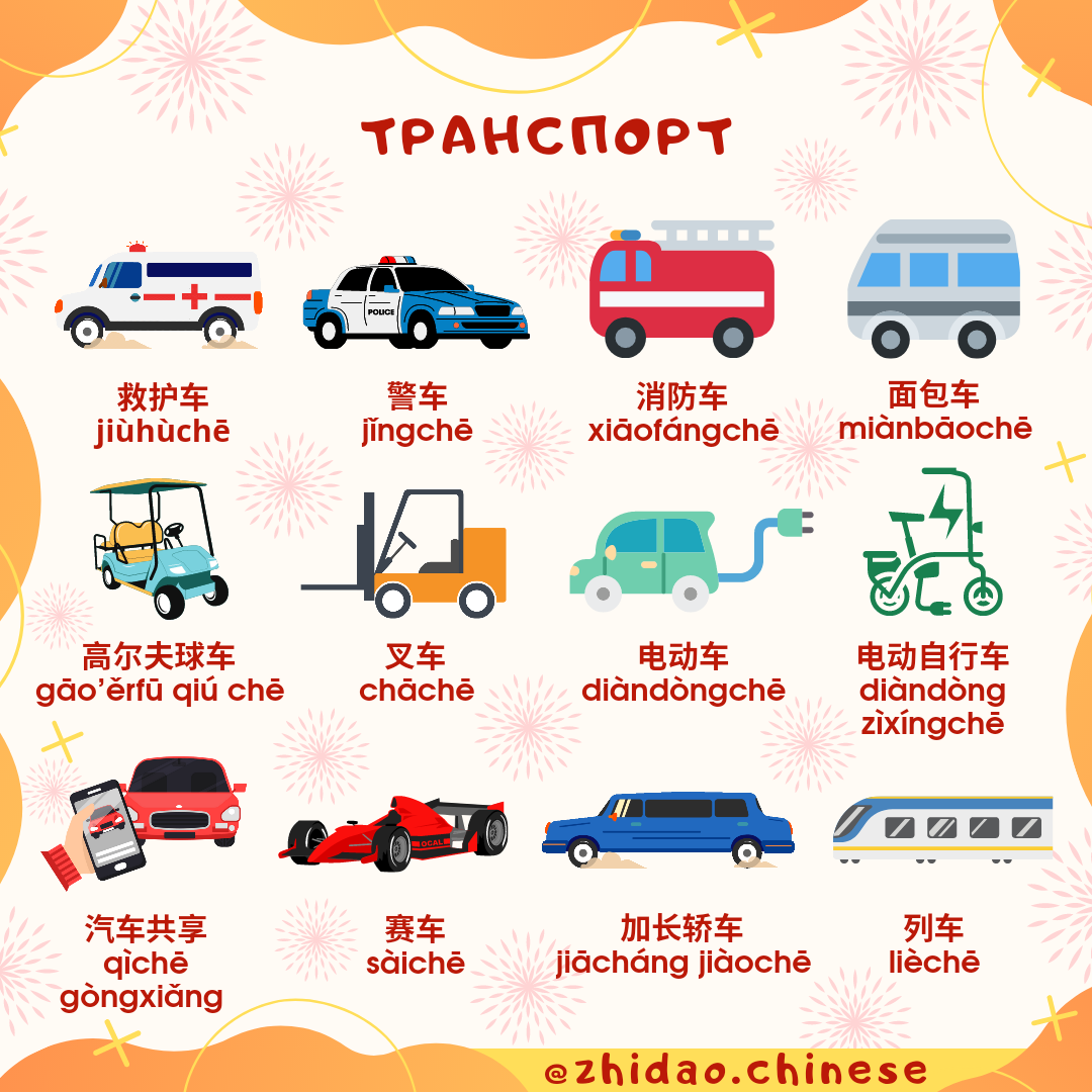 #zhidao_шпаргалки 📝 Сегодня мы подготовили для вас еще шпаргалку на тему "Транспорт" 🚑 🔸救护车 jiùhùchē машина скорой помощи 🔸警车 jǐngchē полицейская машина 🔸消防车 xiāofángchē пожарная машина 🔸面包车 miànbāochē микроавтобус, буханка (вид микроавтобусов) 🔸高尔夫球车 gāo’ěrfū qiú chē машина для гольфа, гольф-карт 🔸叉车 chāchē погрузчик (вилочный) 🔸电动车 diàndòngchē электромобиль 🔸电动自行车 diàndòng zìxíngchē электрический велосипед 🔸汽车共享 qìchē gòngxiǎng прокат автомобилей, каршеринг 🔸赛车 sàichē гоночный автомобиль 🔸加长轿车 jiācháng jiàochē лимузин 🔸列车 lièchē поезд; состав 📝 Ссылка на карточки Quizlet для изучения новых слов: https://quizlet.com/_bshi2x?x=1qqt&i=2r5snr ❗В Quizlet вы можете послушать произношение всех слов! Для этого в различных режимах изучения или при просмотре списка слов нажмите на значок микрофона 🔊 📚 Хотите, чтобы Вы или Ваш ребенок заговорили на китайском? Напишите нам для записи на групповые / индивидуальные занятия! 🎓 #china #chinese #школакитайского #китайский #м