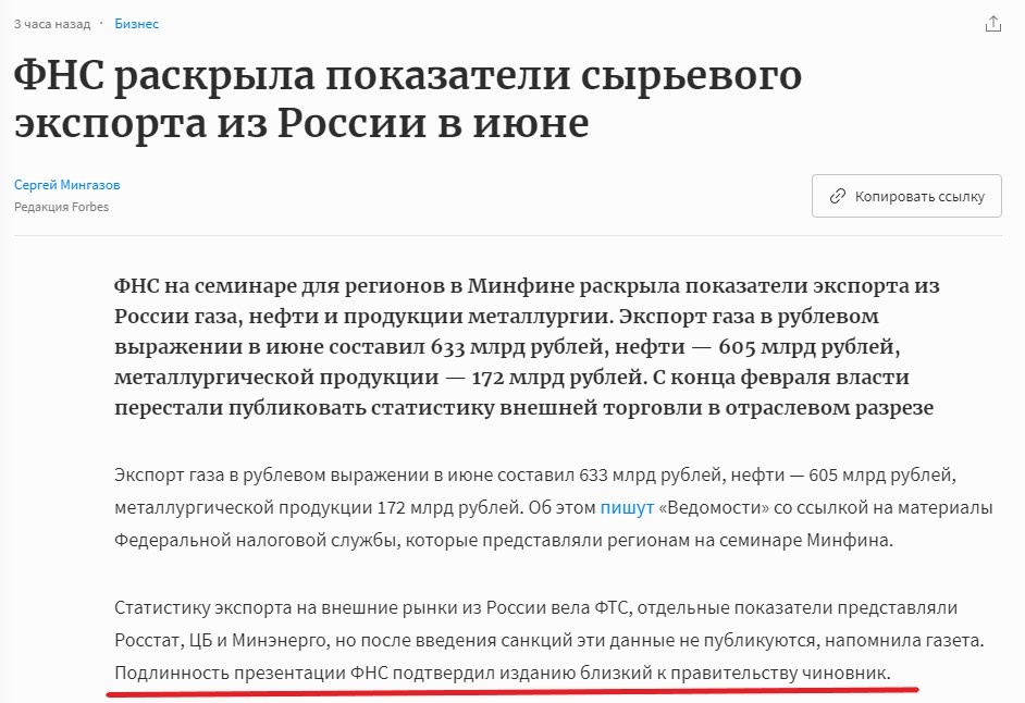 Все последние месяцы я писал о том, что показатели российского сырьевого экспорта будут сильно падать. И всегда появлялось огромное количество комментаторов, которые начинали со мной спорить, и, как правило, в очень агрессивной форме (можете сами почитать комментарии, например, к вышеуказанным статьям). Они яростно доказывали, что никто никуда не денется, и будут покупать российскую нефть, газ, металлы, как миленькие. Показатели экспорта по отраслям уже несколько месяцев как засекречены (чтоб враги не узнали, и россияне не видели, что творится с экономикой). Степень секретности несколько раз за это время повышалась: теперь засекречены не только данные экспорта, но и данные добычи и потребления природных ресурсов. Но вот, наконец, появилась официальная информация, из которой можно оценить, как изменились показатели российского сырьевого экспорта, несмотря на все секреты. И она отлично демонстрирует, кто оказался прав. Информация эта исходит от самого что ни на есть официального ведомст