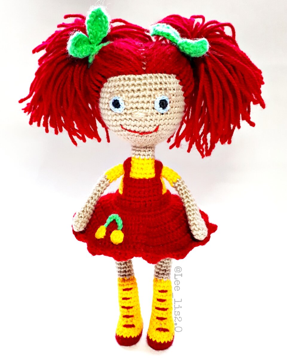 Всем привет! Связала такую куколку. Рост примерно 21 см. Сидеть сама не умеет, зато неожиданно хорошо стоит без поддержки.😅 Связана в подарок для свекрови. Впервые сделала волосы таким способом. Всем хорошего дня!