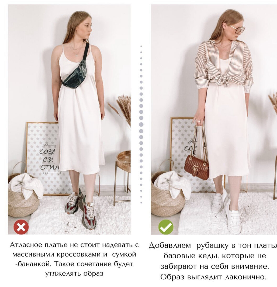 Привет, модницы! 🌟Сегодня небольшая заметка про бельевое платье, атласное платье. Рассматриваем образы для лета, а не для холодного времени года, везде есть свои нюансы. Хочу подчеркнуть, чтолучше всего брать модель без кружева , приложу в истории ссылку на моё платье. . . 📎Длина. Оптимальная длина платья чтобы вытянуть силуэт - это длина до середины голени или выше колена. Какое будет универсальным? На мой взгляд более универсальным будет модель длины миди. Её можно надеть с кедами, с босоножками. А в холодное время года дополнить ботинками. Укороченная модель более капризная, но тоже будет актулаьна. . 📎Как носить платье в жару? Да, пост посвящаю именно жаркому сезону, платье из тонкой атласной ткани лучше всего дополнять открытой обувью, для летнего сезона такое сочетание будет наиболее удачным, отложите лоферы на грубой подошве, а вот открытые босоножки на грубой подошве вполне подойдут. А что если хочется надеть спортивную обувь? Тут выбираем базовые кеды, а не трендовые масс