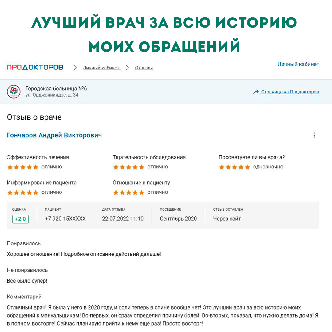 Благодарность врачу ГКБ №6, Гончарову Андрею Викторовичу. Хорошее отношение! Все было супер! Отличный врач! Я была у него в 2020 году, и боли теперь в спине вообще нет! Это лучший врач за всю историю моих обращений к мануальщикам! Во-первых, он сразу определил причину болей! Во-вторых, показал, что нужно делать дома! Я в полном восторге! Сейчас планирую прийти к нему ещё раз! Просто восторг!