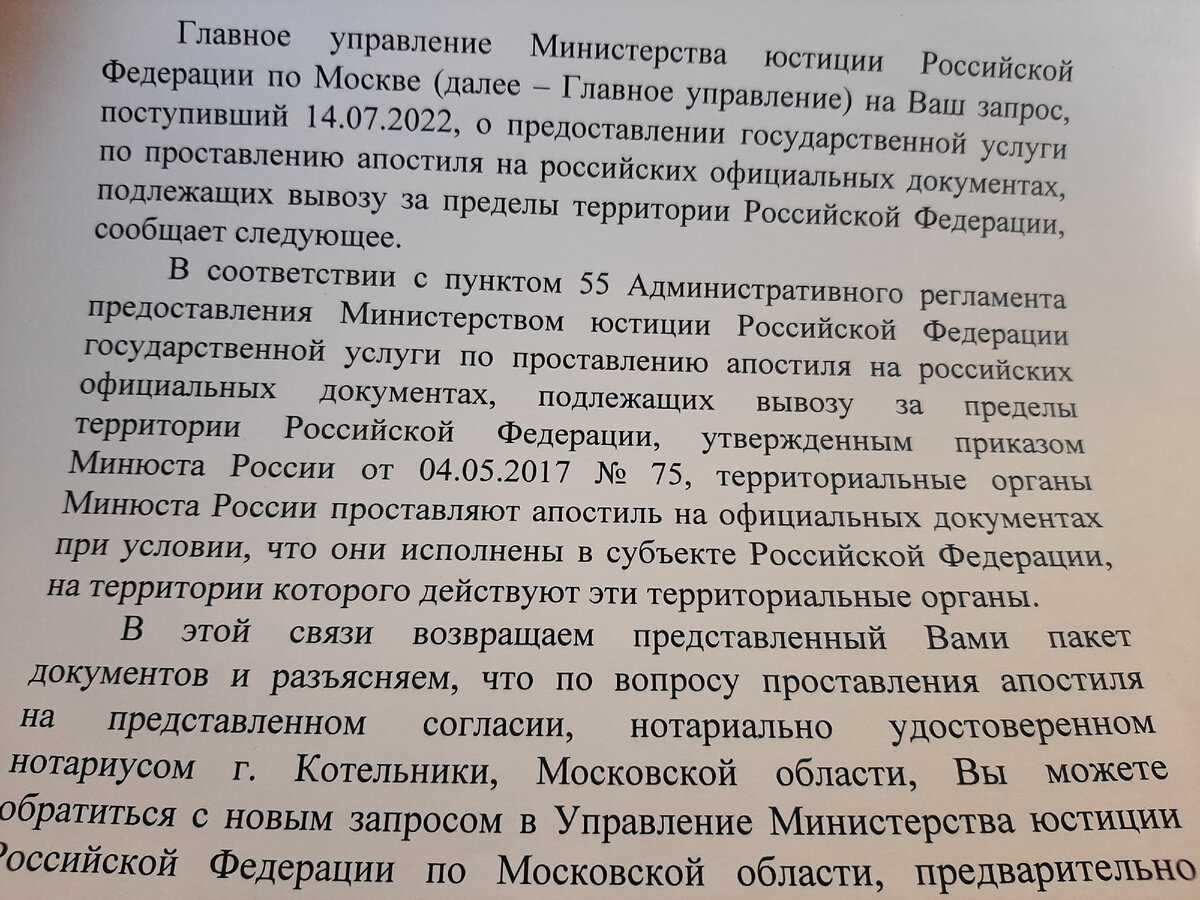 Зря наверное я нахваливал флагманский МФЦ. Сглазил по ходу. Везде человеческий фактор. Но как говорится, Бог любит троицу. Хотя при других раскладах, Бог не дурак - любит пятак. Так видно и получится. Предыдущие байки про апостиль здесь: Позвонили, говорят, приезжайте за последним документом. Ну, взял туесок, водичку, ибо жарко в столице и пошлындал. Приехал в МФЦ, видно все на дачах, чистота чистотайд. Взял талон и как десантура из самолета "первый пошел". Тетя в окне встретила с чрезвычайной любезностью, вручив отказ в апостилировании. Не поленились, набили текст. Я культурный человек, люблю прогуливаться по аллеям с томиком, сука, Бунина. Но тут честно говоря не сдержался и млякнул. Конечно, уже проклял тот день, когда один из документов заверил на ходу, у подмосковного нотариуса. Но вот не думал, что настолько критична, разница в субъектах. Пока я ругался и угрожал написать самому Патриарху, чтобы предал анафеме все МФЦ, в том числе и флагманского значения, работники разводили