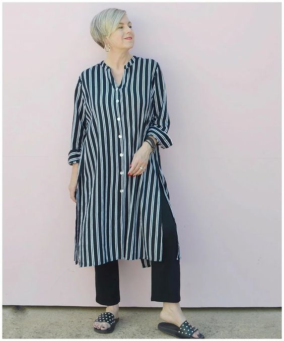 - Модный комплект из платья-рубашки и брюк. Брюки белого цвета, зауженные, немного укороченные. К ним подобрали белую майку. А поврх майки надели платье-рубашку в вертикальную полоску белого и бирюзового цвета. Платье можно носить, не застегивая. В боковых швах платья довольно высокие разрезы, поэтому, при желании, полы платья можно завязать узлом чуть ниже линии талии.