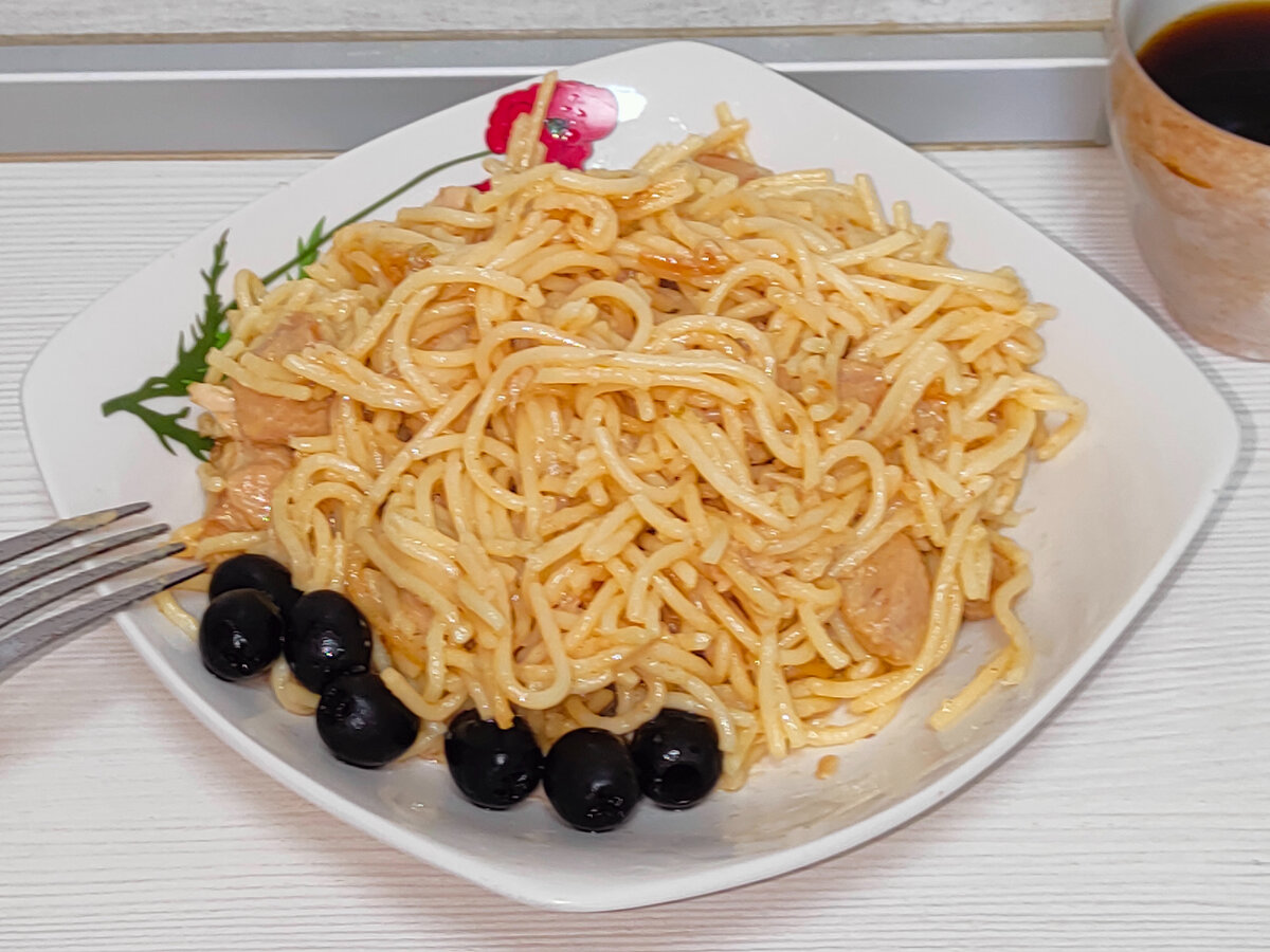 Привет! Эта идея ужина очень подойдет тем, кто любит макароны, но устал от макарон с сосиской на ужин ( ведь это отнимает минимум времени после рабочего дня). Этот рецепт отнимет чуть больше времени, но зато здесь есть варианты и предоставляется возможность проявить фантазию! Я вообще люблю еду в приготовлении которой, не нужно строго соблюдать пропорции и рецептуру )). Начнем: Берем любое мясо, которое быстро готовится. Филе курицы, индейки или не жирную свинину. Нарезаем произвольно, не большими кубиками или как душе угодно и обжариваем на сковороде с маслом и луком ( можно даже без лука) практически до готовности, но сильно не зажариваем. Солим, перчим, можно добавить любимую приправу. Я добавила немного универсальной смеси. Между делом варим свои любимые макаронные изделия. Лучше конечно из твердых сортов пшеницы, что бы не промывать, тем самым не охлаждать их. Не стоит брать слишком крупные, но и паутинка тоже не подойдет. Берите что -то среднего размера. Следующим шагом выклад