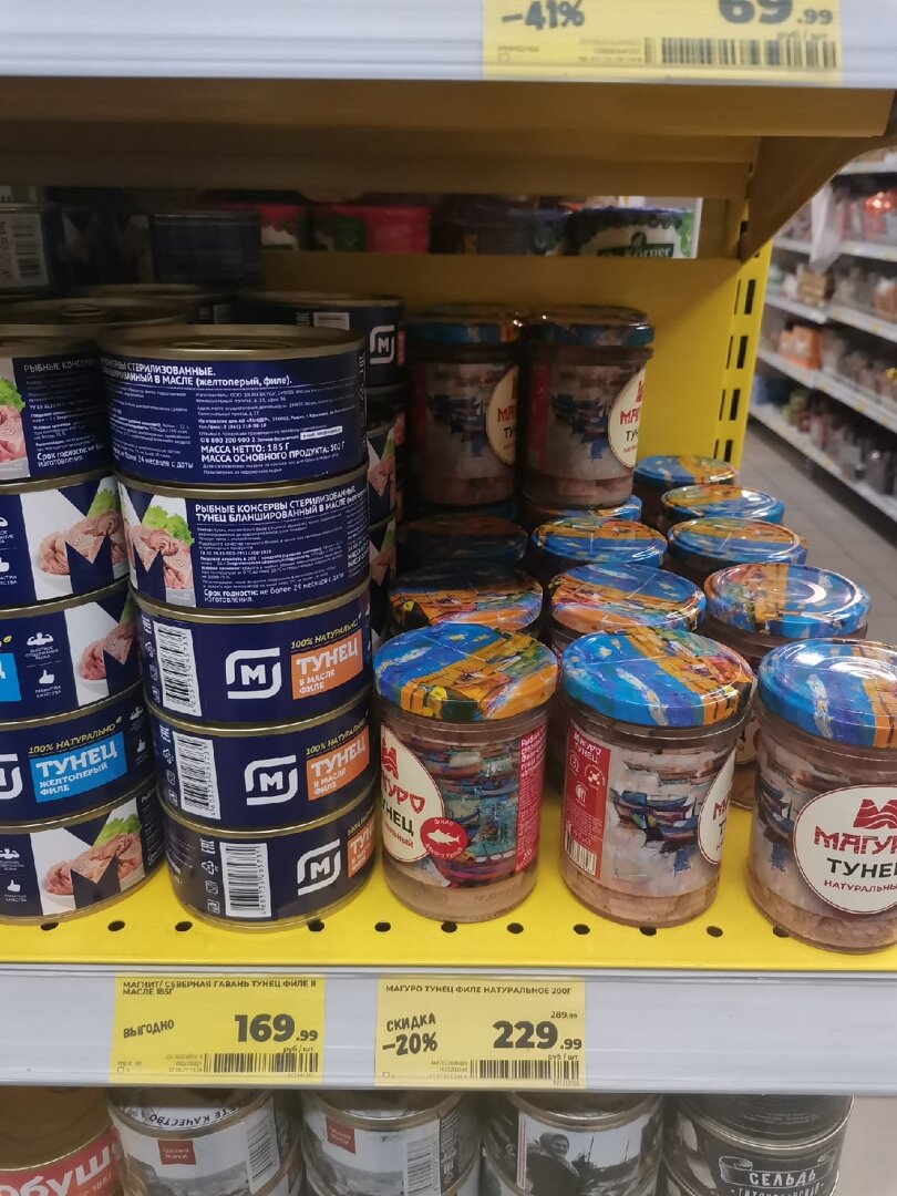 Так-так-так, идем покупать продукты, а заодно стараемся сэкономить, так что пришло время поговорить о том, что ждет покупателей "Магнита", которые захотят присмотреться к желтым ценникам. Именно так и обозначаются скидки, но, кто не первый раз тут, прекрасно понимает что далеко не всему написанному можно верить, а посему сейчас все вместе и будем обсуждать выгодность предложенных акций. Мне нужны были продукты, причем я даже пришла со списком, чтобы ничего не забыть, так что и рассказывать буду только про съедобную часть ассортимента. В сторону бытовой химии и товаров для дома и не доходила, так что про них поговорим в другой раз. А сейчас посмотрим на первую продуктовую находку, которую я отметила положительным отзывом: Очень люблю тунца, это в принципе единственный вид рыбных консервов, который я покупаю на постоянной основе, но что-то то бренды пропадают, что мне понравились, то качество становится слишком уж не стабильным. Увидела натурального тунца от "Магуро", который находится в