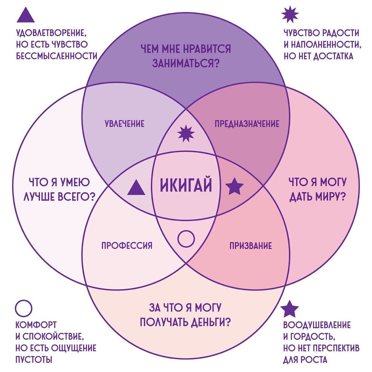 Икигай — японское понятие, означающее ощущение собственного предназначения в жизни; Философия, помогающая находить удовлетворение, радость и осознанность во всех делах каждый день. Благодаря икигай человек учится приводить в порядок мысли, замечать красоту окружающего мира и радоваться мелочам, обретает гармонию и душевный покой. Это состояние души, аналогичное счастью, которое достигается гармоничным пересечением интересов, призвания, общественной миссии и труда, приносящего доход. Иными словами, икигай — это смысл жизни. Японцы убеждены, что на физическое здоровье человека влияет его умственно-эмоциональное состояние. Так же японцы считают, что у каждого есть икигай — особое пересечение страсти, таланта и способности приносить пользу другим. Остается только найти его. Путь к икигай может потребовать времени, глубокого самоанализа и усилий, но мы все можем его совершить. Концепция икигай отражена в хорошо известной диаграмме. Эта диаграмма включает четыре пересекающиеся сферы: Что