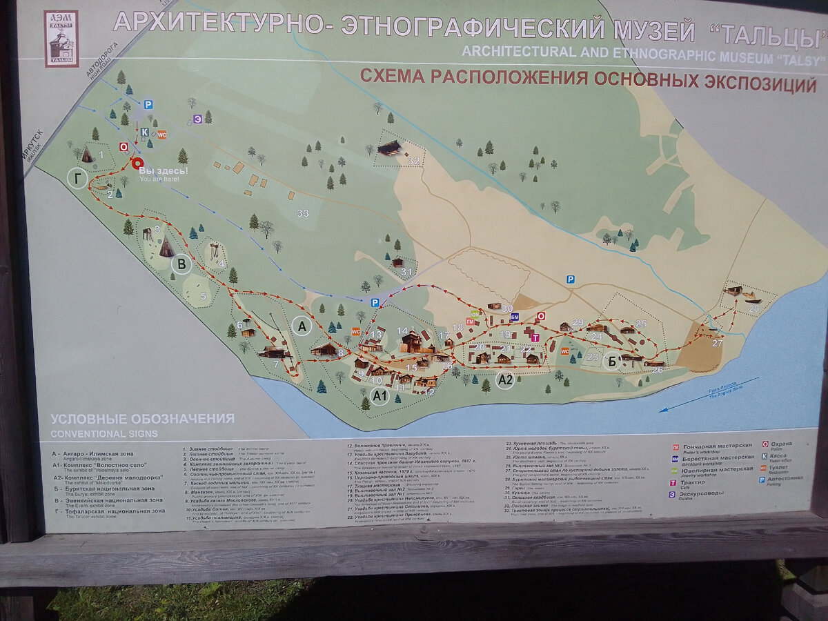 Проехав две трети пути между Иркутском и Листвянкой видишь указатель - Иркутский архитектурно-этнографический музей «Тальцы». Впрочем, туда мы заехали на обратном пути из Листвянки. И не пожалели. Что интересно, вся информация дана на трёх языках – русском, английском и … китайском. Вежливый охранник подходит и объясняет по схеме, куда нам идти. Вначале мы попадаем в стойбище тофаларов. Тофалары проживают на территории Тофаларии, юго-западной части Нижнеудинского района Иркутской области, в бассейнах рек Бирюсы, Кана, Ии и других на северо-восточных склонах Восточного Саяна в основном в созданных в 1920—1930-х годах населённых пунктах, куда были принудительно переселены при переведении на оседлый образ жизни. Сейчас численность этого народа составляет около 800 человек. Дальше тропа нас приводит к эвенкийскому стойбищу. Раньше эвенкийцев называли тунгусами. Сейчас их численность составляет около 77 тысяч человек, причём большее их количество, 40 тысяч, проживает в Китае. Дальше троп