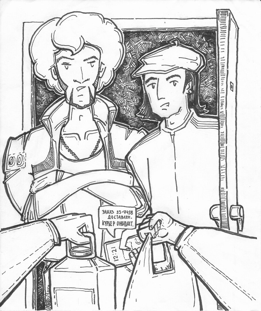 О чём, собственно, сам комикс? Здесь визуализировано своеобразное представление автора о том, если бы курьерские лавки росли, словно грибы после дождя. К тому же Иван во время работы над своим комиксом работал в "Яндекс. Лавке", что давало ему новые идеи для творчества. Начинается комикс с того, что нам показывают неназванный город в альтернативной России, где в связи с растущим числом населения было принято решение практически везде построить лавки со всеми мыслимыми и немыслимыми товарами. Все мы знаем, что сейчас можно без особых проблем заказывать еду прямо к себе домой, и в этом моменте подобное обыграно просто великолепно. В этой странице нам рассказывают про одно особое правило, в котором курьеру необходимо уложиться в 15 минут доставки. Здесь нам показывают быт курьеров и происходит диалог между ними. Больше всего мне запомнился Саня, который является "невезучим" курьером, так как ему достаются не самые лучшие заказы и он как раз тот персонаж, еле успевший вернуться с Невског