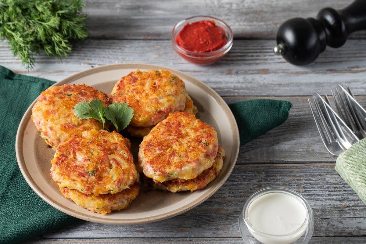 Ингредиенты: - Картофель - 650 г. - Лук - 160 г. - Варёная колбаса - 200 г. - Сыр - 200 г. - Яйцо - 2 шт. - Укроп - 0,5 пучка - Мука - 80 г. - Соль, перец - по вкусу - Растительное масло - для жарки Приготовление: 1. Картофель, лук почистить и натереть на крупной терке. 2. Затем вареную колбасу, сыр также натереть на крупной терке. 3. В получившуюся массу добавить мелко нарезанный укроп, соль, перец по вкусу и перемешать. 4. Затем добавить яйца, муку и перемешать тщательно. 5. Из получившейся массы сформировать тонкие котлеты (по 1 столовой ложке) и жарить на среднем огне до золотистой корочки с каждой стороны, примерно 5-7 минут с каждой стороны.