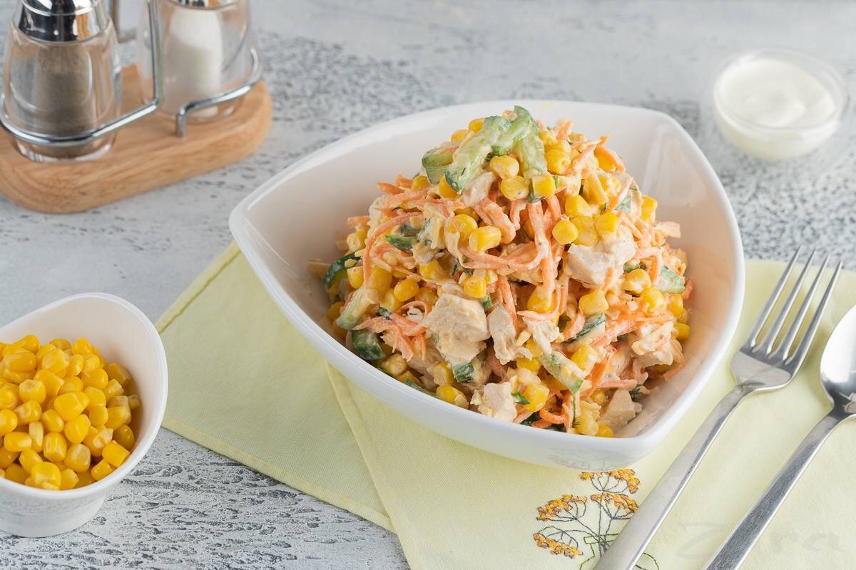 Ингредиенты: - Отварная куриная грудка - 200 г. - Морковча - 180 г. - Огурцы - 100 г. - Консервированная кукуруза - 140 г. - Сыр - 50 г. - Сметана - 100 г. - Соль - по вкусу Приготовление: 1. Вареную куриную грудку нарезать на небольшие кусочки. 2. Огурец нарезать соломкой. 3. Сыр натереть на крупной терке. 4. Смешать курицу, морковь, огурец, кукурузу и сыр. 5. Затем добавить соль и заправить сметаной.