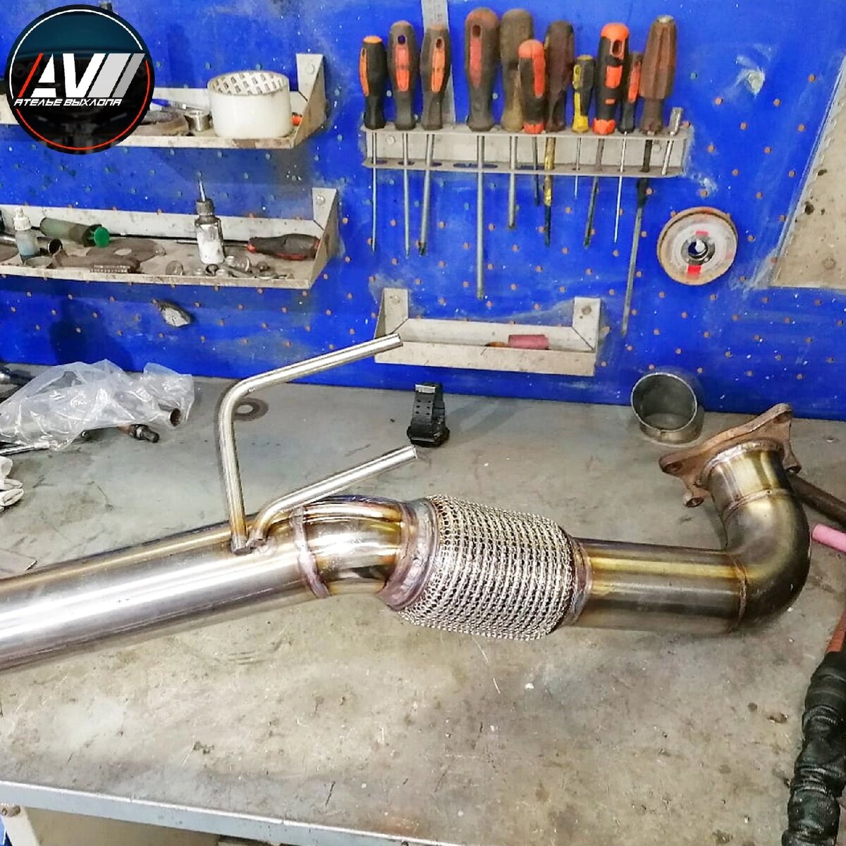 Тебе нужен Даунпайп! (Downpipe) Ателье Выхлопа и Лаборатория Скорости Изготовление даунпайпа под ваши задачи. Нержавеющая сталь AISI304L. Гофра Hudra Custom. Фланец V-band. Термоизоляция HeatShield! Гарантия 2 года. Почти все современные турбо-моторы имеют "болезнь" в виде конструктивно неправильного с точки зрения производительности двигателя участка выхлопной системы, следующей после турбокомпрессора. Этот участок называется "Даунпайп" или "Downpipe" "А что же здесь не так?" - спросите Вы, ведь инженеры не зря едят свой хлеб, разрабатывая двигатель и выхлопную систему к нему Но ведь если бы все было с завода сделано как надо и в мире не существовало бы экологических норм, такой вещи как тюнинг вовсе не появилось бы на свет "Неправильность" даунпайпа начинается с самого выхода из турбины: фланец, прилегающий к турбине имеет внутренний диаметр от 70мм, что обусловлено размерами крыльчатки турбокомпрессора. Зачастую разработчики просто резко сужают диаметр трубы после