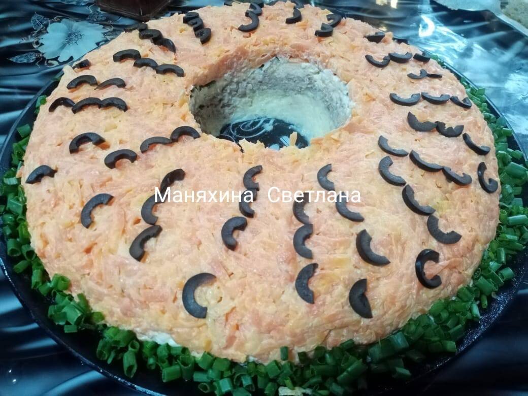 #июль #вкусно #меню #пятница #салаты #моирецепты Нашла в интернете рецепт, немного изменила под себя) Ингредиенты: сайра в масле, вареных картофелин, вареных моркови, вареных яйца, Зеленый лук, Майонез , Соль , Перец черный молотый , Маслины Способ приготовления: Картофель, морковь, яйца натереть на средней терке. Маслины порезать соломкой. Лук измельчить. Выкладываем слоями, в середину поставив баночку, чтобы получалось кольцо: смешать картофель с майонезом, посолить, поперчить. Второй слой, смешать консерву без жидкости, размятую вилкой с майонезом, посолить, поперчить. Третий слой: смешать яйца с майонезом, посолить, поперчить. Посыпать немного зеленым луком. Последний слой: морковь, смешанная с майонезом. Поверх моркови выложить полоски маслин по кругу. По края салата выложить зеленый лук. Дать пропитаться часа 3 в холодильнике. Убрать банку и подавать на стол. Ооочень вкусно😊приятного аппетита!!!