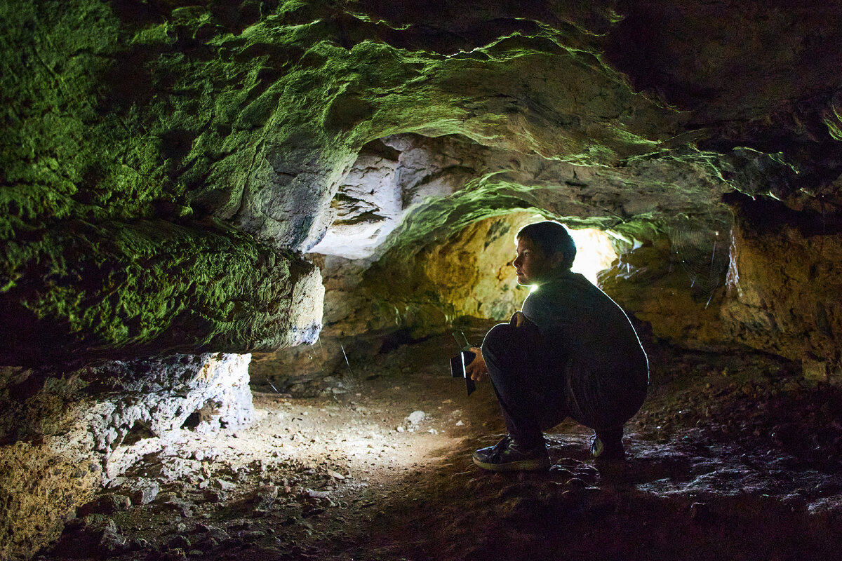 В дальний угол пещеры не ходили. Фонарик был один на двоих, а пол очень скользкий. Решили вернуться сюда с бОльшим арсеналом осветительных приборов.