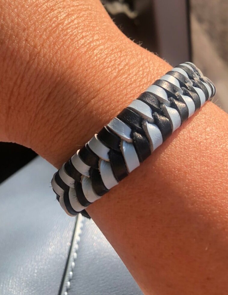 Приятно в разгар замечательных выходных получить фотографию от довольного обладателя твоего изделия. А как подходит к сумочке! Муж предполагал, что его сестре вряд ли в гардеробе пригодится кожаный браслет. Однако, вышло иначе. Маша была очень рада подарку. Ответственно выбирала цвета и с нетерпением ждала возможности забрать браслет. Теперь вот надевает его. Пусть он принесёт ей силу и удачу. Как и полагается "Летнице" по-женски бережёт и вдохновляет нашу дорогую сестрёнку. Здорово, когда вещь сделана не напрасно. Спасибо за фото, Машечка.