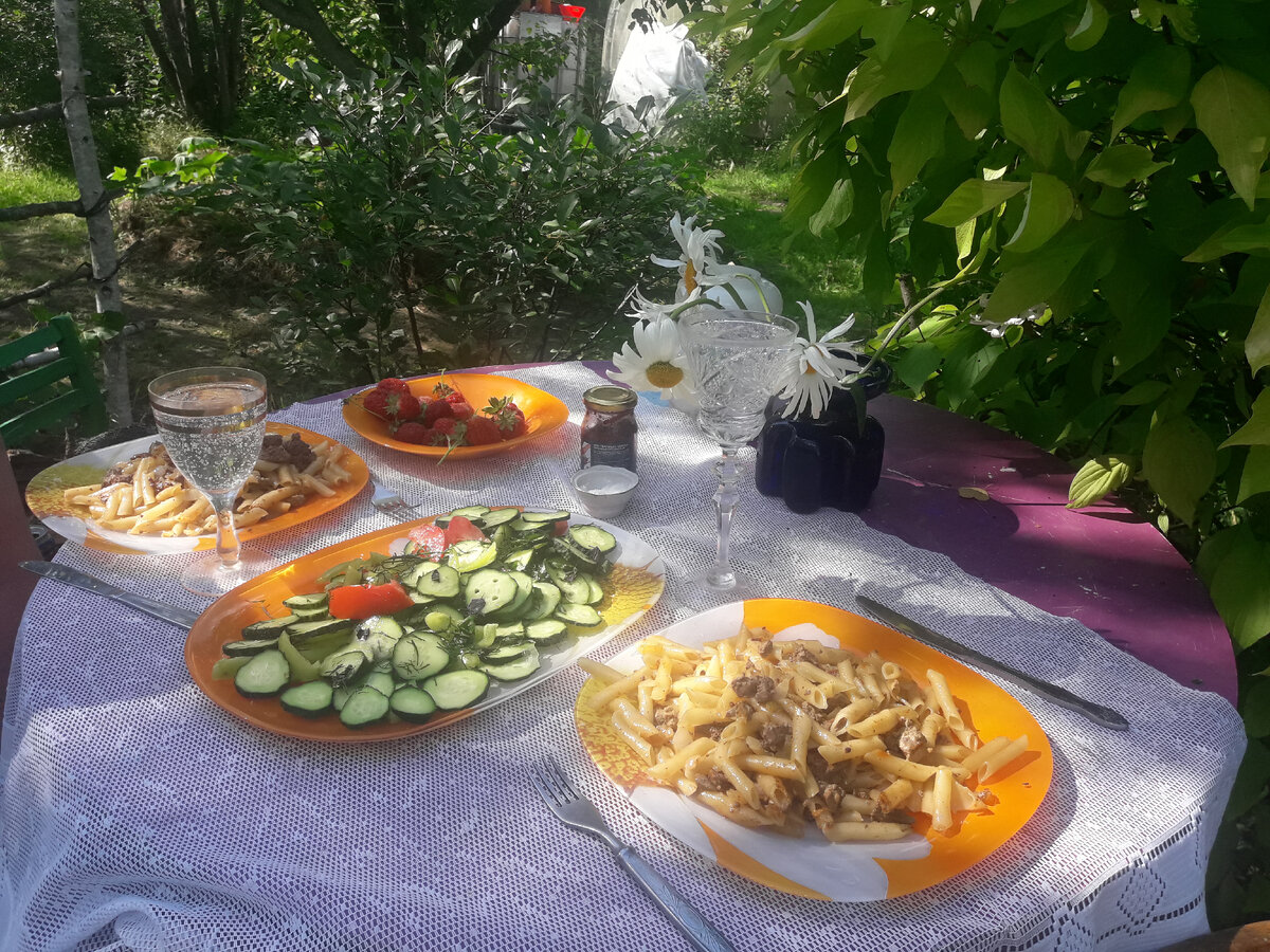 Приехали в воскресенье на дачу. Покажу наш обед под открытым небом
