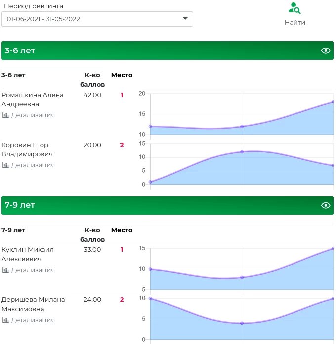 1. Таблица результатов рейтинга. Рейтинг формируется с разделением по возрастным группам. Для каждой возрастной группы данные отображаются в табличном виде: - ФИО ученика; - Суммарное количество баллов; - Место в возрастной группе; - График динамики по результатам мероприятий. 2. Фильтр по пользователям в таблице результатов. Данные в таблице результатов доступны только по пользователям согласно правам доступа. Например, учителя могут видеть результаты только своих учеников, администраторы - результаты учеников всех учителей. Возможна фильтрация по ФИО, группам, учителям, филиалам и т.д. 3. Рейтинг мероприятий в кабинете клиента. В личном кабинете ученика доступны результаты рейтинга. График динамики по баллам строится согласно результатам на мероприятиях. Под графиком отображается хронология мероприятий с результатами ученика. Источник https://akratoprime.ru/news/rejting-ucenikov-po-rezultatam-meropriatij-i-testov