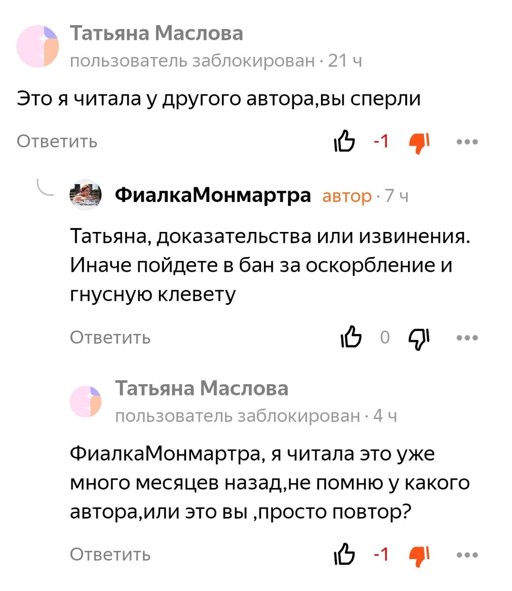 Истории свои я пишу сама - либо на реальной основе, либо придумываю сама. Бывает, что основой для рассказа служит чей-либо комментарий - тогда я указываю на этот факт в начале или в конце статьи и, при возможности, привожу ссылку. Бывает, что меня цепляет статья другого автора, и я понимаю, что мне есть что рассказать на ту же тему - и в этом случае я ничего не скрываю. И, тем не менее, обвинения в плагиате изредка прилетают.