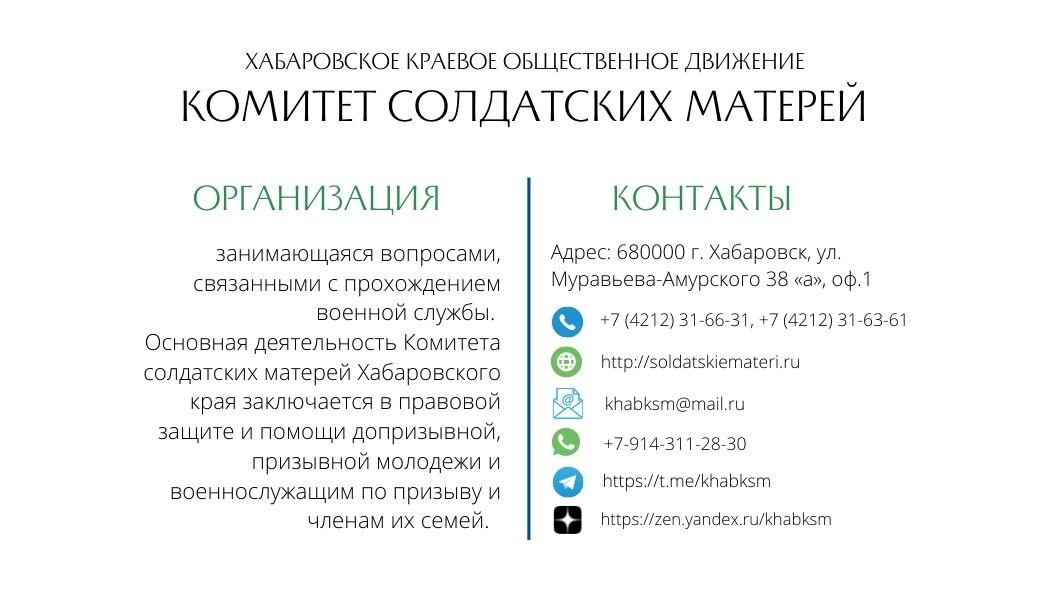 Хабаровское краевое общественное движение "Комитет солдатских матерей" образован 30 марта 1995 года, является некоммерческой правозащитной организацией, занимающееся вопросами, связанными с прохождением военной службы. Основная деятельность Комитета солдатских матерей Хабаровского края заключается в помощи допризывной, призывной молодежи и военнослужащим по призыву и членам их семей. За время работы Комитета более 30000 военнослужащих и членов их семей получили правовую и благотворительную помощь. Во время боевых действий в Чеченской республике, представители комитета 13 раз выезжали с гуманитарной миссией к военнослужащим Дальневосточникам выполнявшим боевые задачи по установлению конституционного строя. Привозили военнослужащим письма, посылки от родных и близких, учащихся учебных заведений края и неравнодушных граждан проживающих на территории Хабаровского края. Доставлены сотни тонн гуманитарного груза. Представители комитета принимали активное участие в работе по освобождению