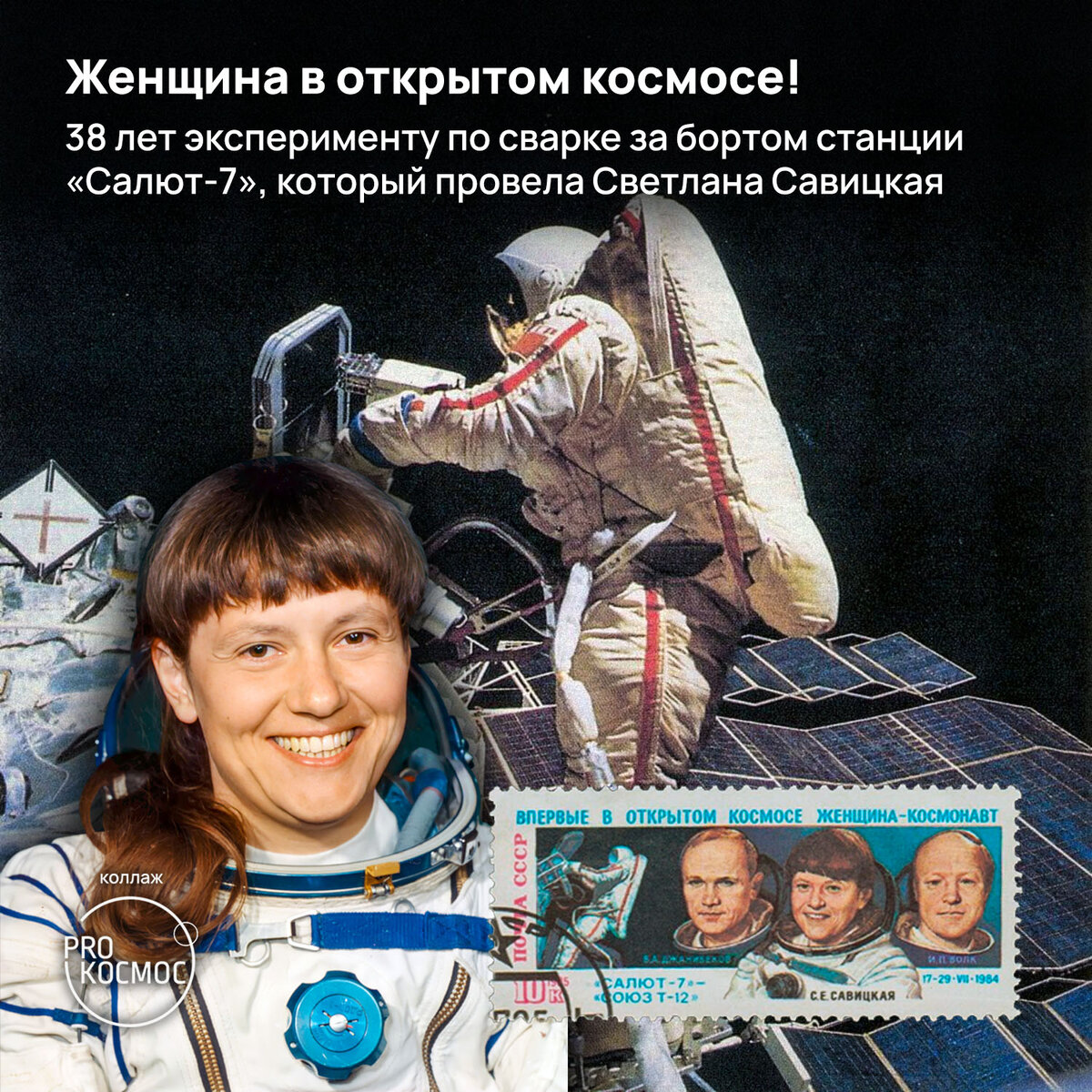 25 июля 1984 года произошло эпохальное событие для маскулинной космонавтики — Светлана Савицкая первой среди женщин вышла в открытый космос для проведения научных работ. Вместе с ней в течение 3 часов и 35 минут за бортом станции «Салют-7» работал и Владимир Джанибеков, который проводил документальную съёмку её работы. Светлана Савицкая провела эксперимент по работе с металлом в открытом космосе — с помощью универсального ручного инструмента (УРИ) она выполняла операции по резке, сварке, пайке металлических пластин и напылению покрытия. Занимательный факт — Савицкая привезла на станцию запись голоса дочки Леонида Кизима Танечки, родившейся 24 мая, когда счастливый отец уже был в космосе. Всего в тот момент на станции находились шестеро космонавтов: — экипаж долговременной экспедиции, прибывший на «Союзе Т-10», в который вошли Леонид Кизим, Владимир Соловьев и Олег Атьков; — и экипаж посещения, прибывший на «Союзе Т-12», состоявший из Владимира Джанибекова, Светланы Савицкой и Игоря Вол