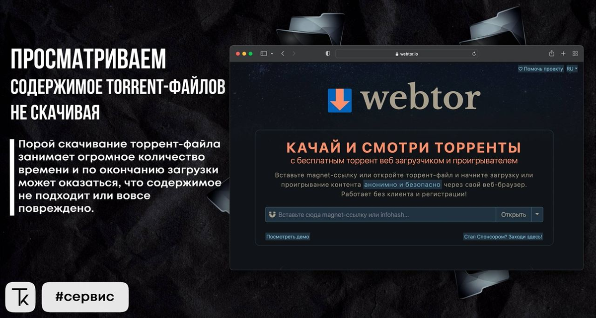 Порой скачивание торрент-файла занимает огромное количество времени и по окончанию загрузки может оказаться, что содержимое не подходит или вовсе повреждено. Чтобы не оказаться в подобной ситуации, можно воспользоваться сервисом Webtor. Он предоставляет безопасный и анонимный доступ к содержимому torrent-файлов, у которых имеются пиры, позволяя как скачивать, так и просматривать медиафайлы без задержки. Весь процесс происходит прямо в браузере и проигрывание начинается без ожидания полной загрузки файла из BitTorrent-сети, что позволяет удобно просматривать фильмы и сериалы даже на мобильных устройствах. Источник #torrent #торрент #сервис