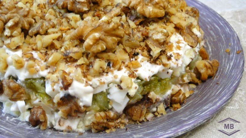Слоёный салат «Принц» подарит не только наслаждение вкусом, но «разогреет» аппетит внешним видом! Сытные слоёные салаты всегда отличный вариант для праздника! Яркие, эффектные и невероятно вкусные! Ингредиенты: 300 грамм говядины, 3 яйца, 3 солёных огурца, 3 дольки чеснока, 150 грамм грецких орехов, майонез – для промазки слоёв. Процесс приготовления: Отварные куриные яйца очищаем от скорлупы. Нарезаем кубиками или натираем на тёрке. Говядину отвариваем до готовности. Рвём на волокна или нарезаем кубиками. Солёные огурчики натираем на тёрке. Лишнюю влагу сливаем. Добавляем к массе чеснок, пропущенный через пресс и перемешиваем до однородности. Грецкие орехи измельчаем. Для этого высыпаем их в пищевой пакет и проходимся по нему скалкой. Теперь пересыпаем измельчённые орехи на сухую сковороду и обжариваем на небольшом огне 3-5 минут. Приступаем к сборке салата. На сервировочное блюдо устанавливаем кондитерское кольцо или выкладываем слоёный салат в произвольной форме. Первый слой из