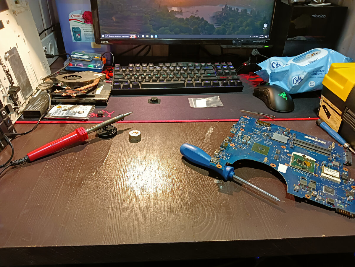 Знакомые попросили в срочном порядке перепаять разъем питания на ноутбуке. А у меня из инструментов только обычный паяльник, олово и канифоль. Ни фена, ни зажимов, ни оплетки для снятия припоя. А самое главное - руки з жопы. Но я согласился. По какой причине попросили перепаять разъем? По такой, что предыдущий разъем расплавил штекер зарядного устройства. При разборке ноута заметил забавную штуку на фото ниже. Кто-то из предыдущих "разборщиков" положил в пустое пространство слева от диска пластиковый дюбель. Я сделал вывод, что человек при сборке ноута мог обмануться и решить, что потерял шурупы от креплений, которые справа от диска. И чтобы диск не выскочил без фиксации шурупами, он подпер его слева дюбелем. Хотя на самом деле эти шурупы вкручиваются через крышку, которая закрывает диск. Я могу, конечно, ошибаться, и дюбель тут по другой причине. Но других объяснений я не придумал. После разборки обнаружилась причина, по которой расплавилась зарядка. Одна из ножек разъема отпаялась и