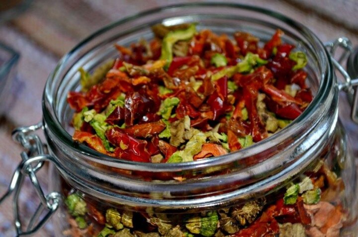 Сегодня хочу поделиться с вами рецептом универсальной приправы из овощей на зиму. Такая приправа поможет сделать блюда яркими и ароматными. Этот рецепт - огромное поле для импровизации. В наше время купить приправу в магазине можно на любой вкус, но в неё для аромата добавляют знаменитый глютомат натрия и другие добавки . Поэтому предлагаю приготовить эту приправу в домашних условиях, будет гораздо вкуснее и ароматнее. Для приготовления подойдут любые овощи и абсолютно любая зелень. Отталкивайтесь только от своих предпочтений. Зелень и овощи которые используем для приправы. Зелень: Укроп Петрушка Базилик Сельдерей Кинза Зелёный лук Овощи: Болгарский перец Горький перец ( на любителя) Помидоры Морковь Свёкла Кабачки Баклажаны Капуста Лук репчатый Чеснок В общем любую из композиций я добавляю зелень и чеснок. У меня сушилка из 5 решёток, я их полностью заполняю. Вот два примера. 1 вариант: 1. Первая решётка - укроп+петрушка(50/50). 2. Вторая решётка - морковь + чеснок. 3. Трет