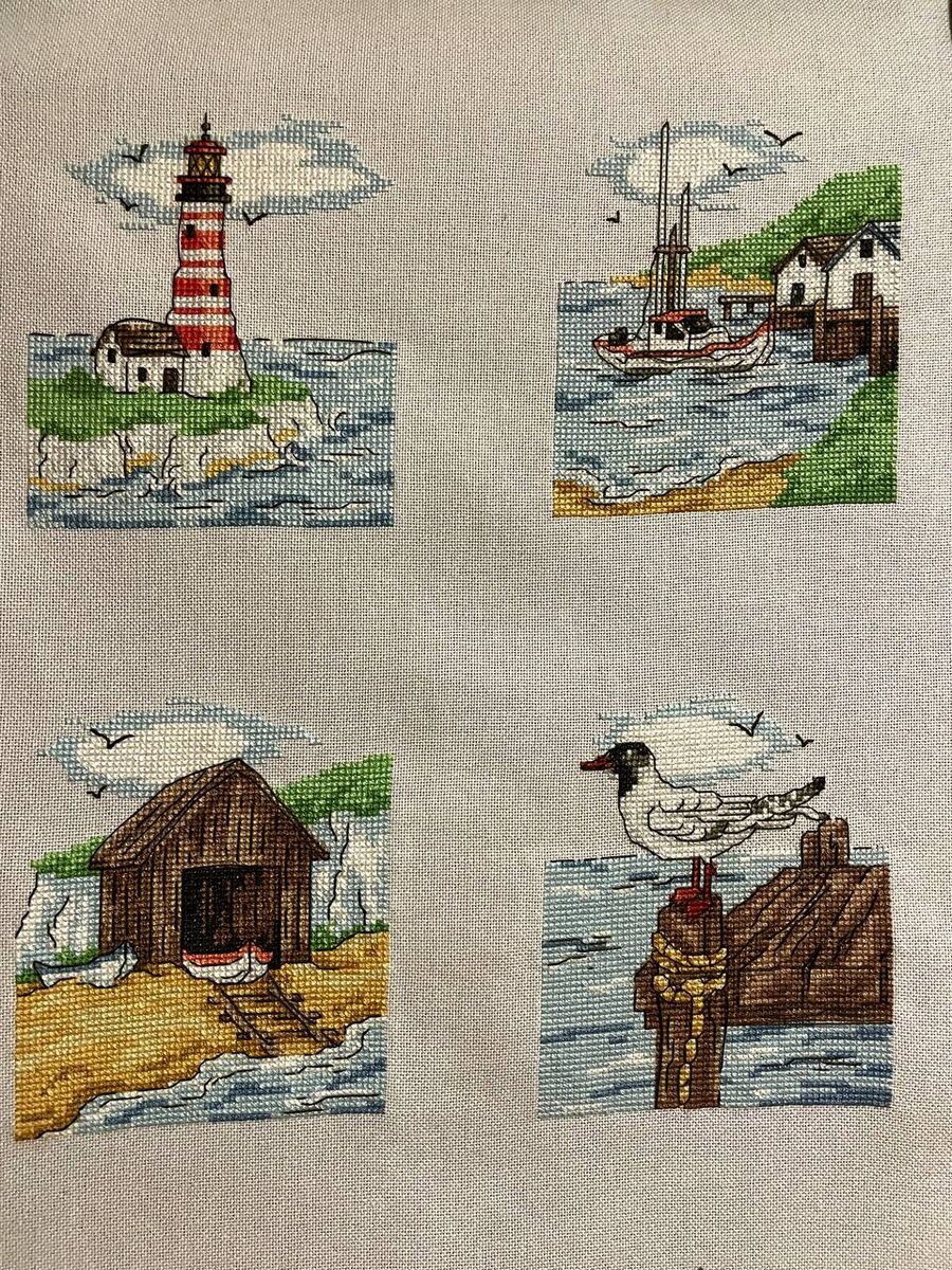 Всем привет! Сегодня расскажу о том, какие ошибки в вышивке совершаю порой именно я. Не буду осуждать других за ошибки. Во-первых, кто я такая чтобы осуждать. Во-вторых, а кто не ошибается? Покажу свои некоторые ошибки на конкретном примере. Немного предыстории. В вышивальном мире очень популярно вышивать морские сюжеты разной направленности (о моих и маминых морских вышивках я уже делала несколько постов: тут, тут и тут). Много хороших разработок на морскую тематику есть у фирмы Dimensions, но мне как-то не хочется их вышивать, поэтому похожие схемы я нашла в журнале Вышитые картины 7/2011. Вышивка еще не оформлена, поэтому сложно было ее сфотографировать. Пора уже перейти к моим ошибкам. Итак, ошибка №1: Изначально я думала каждую миниатюрку оформить отдельную рамку. Но, ошиблась с размерами канвы и расстоянием между каждой вышивкой, поняла, что если я разрежу канву, то мне ее уже не натянут (в багетной мастерской рекомендуют иметь свободный хотя бы по 3 см с каждой стороны, а у м