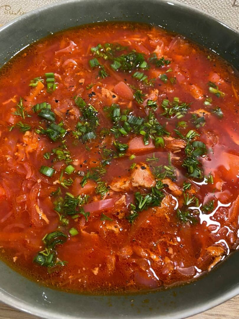 #июль #борщ #курица #говядина #обед #первоеблюдо Ингредиенты: Для бульона:, Курица (спинка и грудка), Свинина на кости, Лавровый лист , Черный перец горошком, Репчатый лук, Морковь, Ботва укропа, Соль, Для зажарки:, Морковь средняя, Свекла средняя, Чеснок, Растительное масло (для жарки), Столовый уксус , Сахар , Томатная паста , Белокочанная капуста средняя , Картофель, Подача:, Укроп, Лук зеленый, Сметана Способ приготовления: Ставим вариться бульон. Промываем мясо, заливаем чистой холодной водой и на сильном огне доводим до кипения. После этого убавляем огонь, чтобы кипело совсем чуть-чуть, снимаем пенку. Добавляем лавровый лист, перец горошком, лук и морковь (можно обжечь на сухой сковородке). Варим мясо около 1 часа. Мясо достаем и разбираем от костей и возвращаем обратно в кастрюлю. Морковь, свеклу, чеснок натираем на крупной терке. Капусту тонко нашинковать. Картофель нарезать кубиками. Делаем зажарку: Свеклу, морковь, чеснок перекладываем в сковороду с растительным маслом и жари