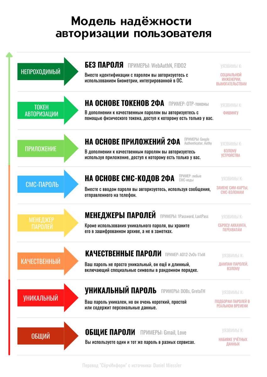 Но и тем, кому не все равно, бывает сложно понять, насколько хорошо аккаунты защищены. Схема выше дает ориентиры. Как видно по ее «цветовой дифференциации», только пароли 3-го уровня могут считаться хоть сколько-нибудь достаточной защитой.