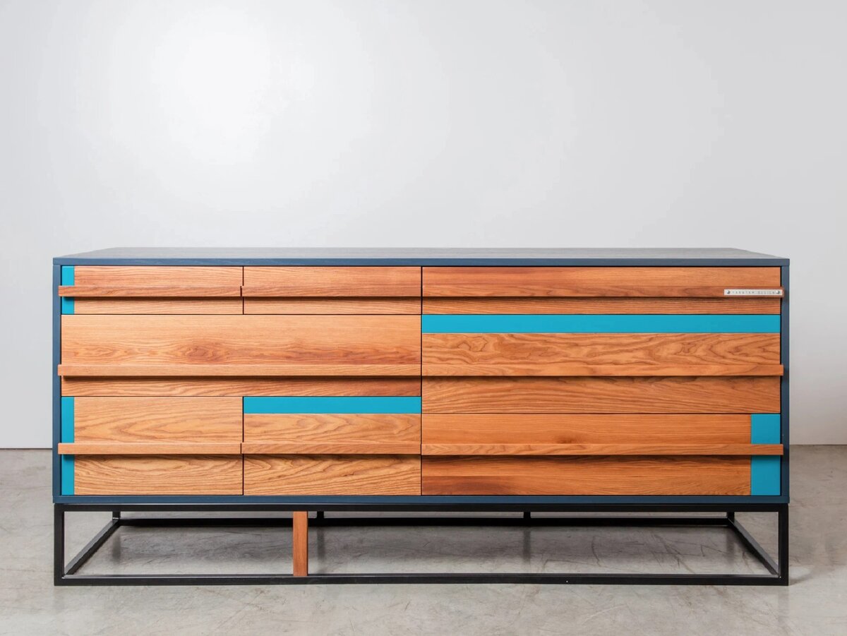 В комоде Камал восемь ящиков разных размеров, формы и глубины. Это позволяет хранить в нем предметы разного назначения и объема. Сочетание янтарного оттенка дерева и ярких вставок гарантировано поднимает настроение и создает уют в доме. Материалы: Корпус - МДФ, эмаль, лак. Ножки - алюминиевый профиль крашеный. Ящики - фанера, лак. Фасады - массив термообработанного ясеня или массив дуба, вставки - крашенный МДФ.