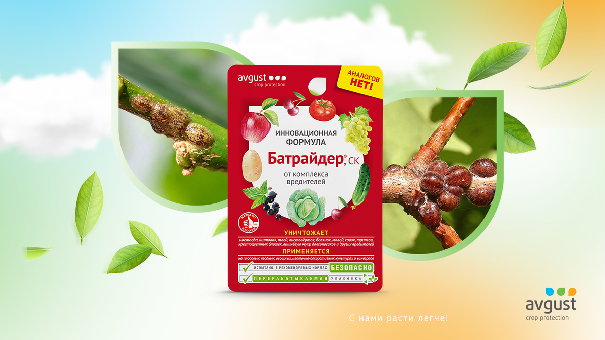 ✔ Благодаря уникальному сочетанию 3 действующих веществ «Батрайдер» эффективен против всех распространенных вредителей сада, огорода и цветника.