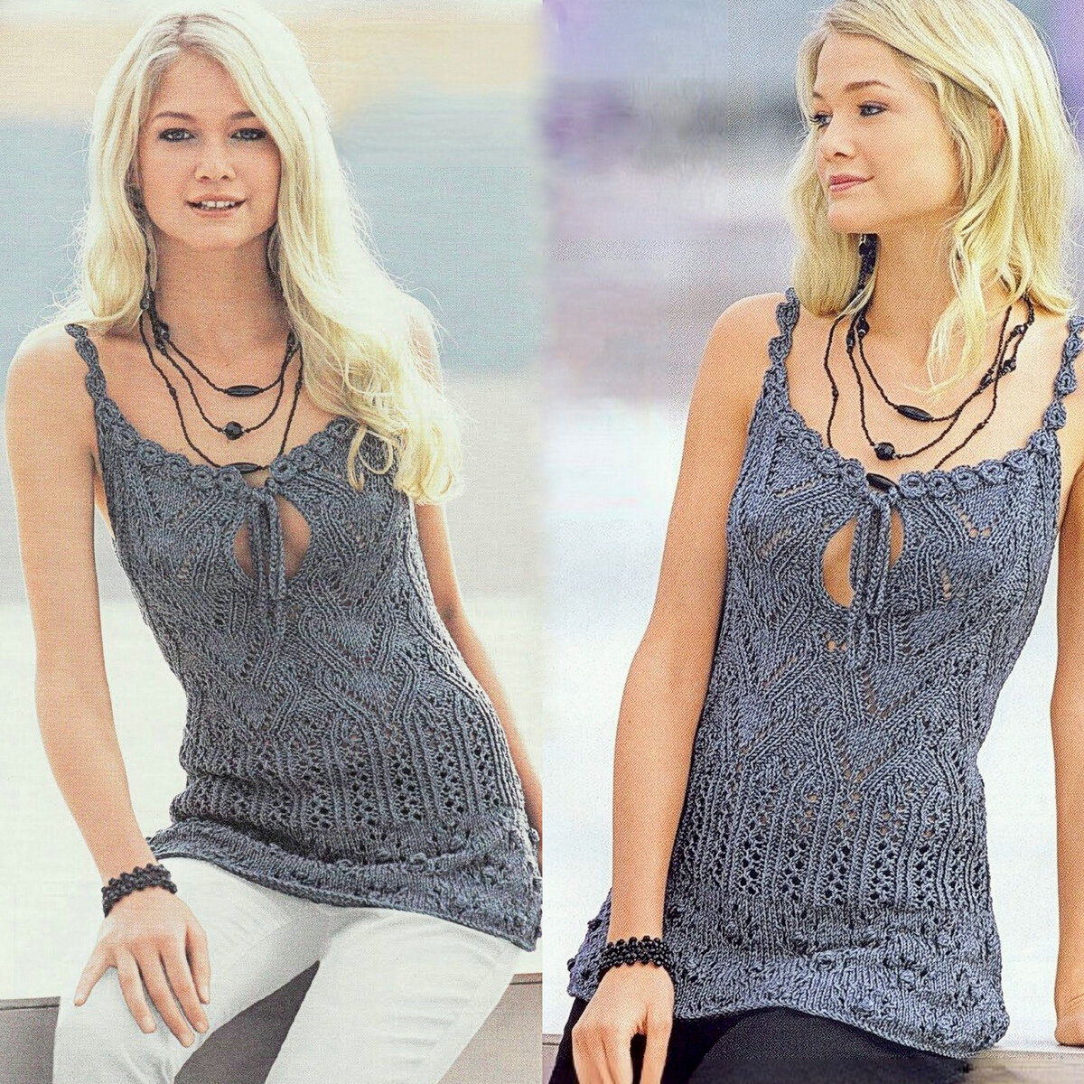 Летняя маечка — это, пожалуй, самый простой и быстрый вариант связать что-нибудь интересное для текущего времени года. Расход пряжи минимальный, времени будет потрачено тоже минимум, а сколько удовольствия! Осталось выбрать понравившуюся модель и вперёд — создавать летний шедевр! А можно сразу несколько!))) Летняя маечка № 1 ❀ Эффектная удлинённая маечка цвета мокрого асфальта. Оригинальная модель с кружевными бретелями и глубоким вырезом на груди (я бы вырез сделала всё же поменьше... а то вывалится ещё чего ненароком 😅). Для вязания этой маечки нам понадобится 400 (450) гр — на размеры 36/38 (44/46) соответственно — пряжи цвета антрацита от Goby: 65% хлопок, 35% вискоза; 50 гр — 85 м. Прямые спицы № 3,5 и № 4, а также круговые спицы и крючок № 3,5. Летняя маечка № 2 ❀ Кто сказал, что летом нельзя вязать косы? Ещё как можно! Оригинальное сочетание объёмных жгутов и крупной сетки из спущенных петель делает эту синюю маечку особенно эффектной и стильной. Чтобы связать такую модель, нам
