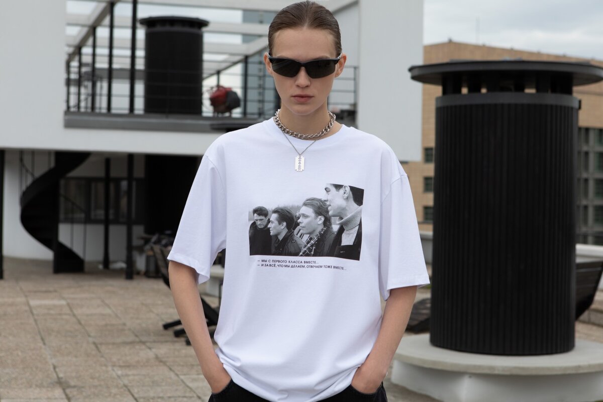 В линейку вошли 7 футболок оверсайз из плотного хлопка, а также лаконичная бейсболка с названием сериала. Одежда выполнена в двух цветах: чёрном и белом. Главный принт — кадры и цитаты из «Бригады».