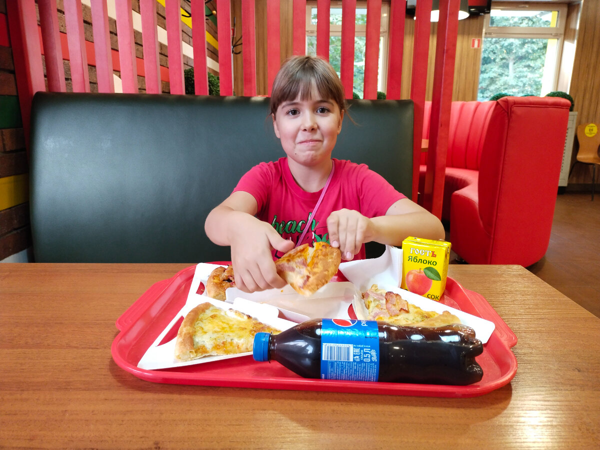 Позувчера закончился недельный домашний арест у дочки. Вчера встретились. Повзрослела за неделю. И голос стал взрослее и черты лица стали четче. Про рост не говорю, все выше и выше тянется к солнцу. Хотел привезти ее в новое место шашлычки поесть. Дама от шашлыка отказалась. Предпочитает пиццу и мороженное. В округе света не оказалось. Кафе с шашлыком оказалось вовсе не кафе, а просто ларек на вынос. Пошли смотреть работает ли Чикен пицца. Оказалось работает. На двери висит большое объявление об аренде и Я думал, что оно закрыто. Оказалось работает. Девочка обрадовалась. Ещё больше обрадовалась, когда увидела, что в кафе есть игровая комната. Она как ни странно платная - 70 рублей полчаса. Не нашли ту, которая отвечает за зал и берет деньги. Решили пиццы поесть, потом найдется заведующая и она поиграет в ней. Купил несколько разных кусков пиццы по 88 рублей. Девочка хотела детскую, я же взял 4 разных вида. Дочка ещё что-то захотела. Я сказал подожди этого ещё много будет. Поедим, ещё