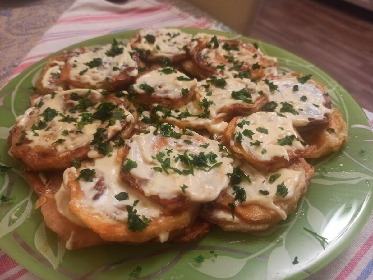 Ингредиенты: Кабачки - 2 шт Соль по вкусу Пшеничная мука - 2 стол.л. Майонез - 5 стол.л. Чеснок - 3 зубчика Подсолнечное масло - 5 стол.л. Петрушка - по вкусу Приготовление: 🔺 Кабачок почистить, нарезать кружочками толщиной не более 2 см. 🔺 Посолить и поставить в холодильник на час - полтора 👌 🔺 Каждый кружок посолить, обвалять в муке. Выложить на разогретую сковороду. 🔺 Жарить кабачки с обеих сторон на умеренном огне до золотистого цвета. 🔺Пока жарятся кабачки , пропустить чеснок через давилку для чеснока, смешать с майонезом и хорошо перемешать соус. По желанию посыпать петрушкой. Кабачки, жареные на сковороде - тот самый случай, когда блюдо готовится элементарно, быстро 😋 . Их можно подать на гарнир к жареному мясу, котлетам, сосискам.......и кстати кабачки жареные на сковороде, почему-то очень нравятся детям, поэтому мамам точно стоит взять мой рецептик на заметку 👌👍👍👍 Приятного аппетита всем 😋😋😋