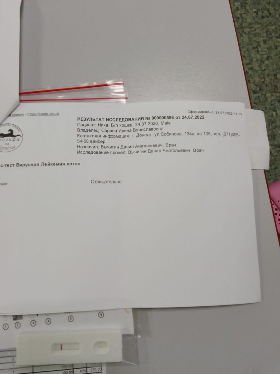 После консультации с доктором перелом носа не подтвердился, просто травма, челюсть целая. Как из рога изобилия: Вася, Соня, Маша да к тому же новая кошечка Происхождение травмы неизвестно. Может и собака укусила, а может и недочеловек постарался(( Но травма это как оказалось не самое страшное, что случилось с Никусей. Мы сдали кровь, тесты на лейкоз и панлейкопению. У Ники полная анемия, красных телец в крови почти нет. Она в критической степени истощения и обезвоживания. Тест на лейкоз отрицательный, а вот на панлейкопению тест показал едва заметную положительную полоску. Это может означать, что у нее только начинает развиваться вирус в организме(( Но сейчас Нику нельзя лечить от панлейкопении, в этом состоянии лечение её просто убьёт (( Сейчас стоит главная задача - это убрать анемию. Для этого Нике будут делать уколы с витаминами, антибиотик и малышке нео
