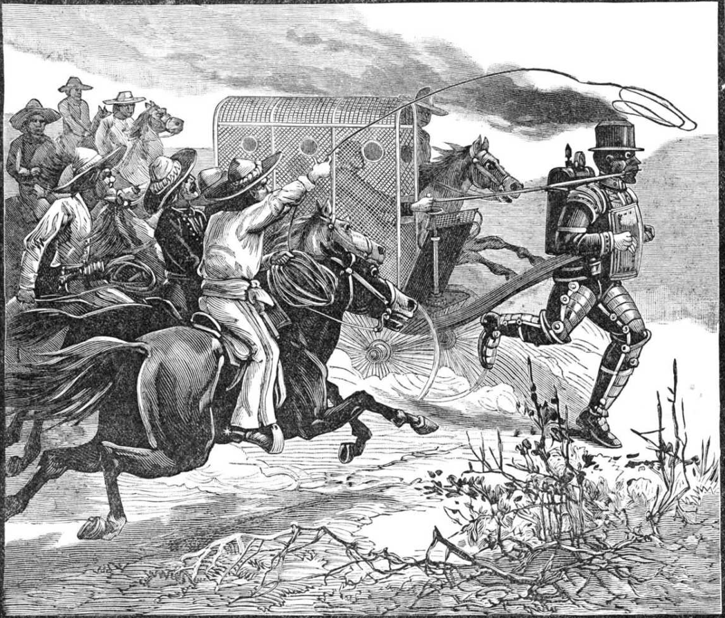 Резервуары с водой находились в ногах и руках человека и были так устроены, что обеспечивали непрерывную циркуляцию воды в котле. Вожжи тянулись от дросселя и свистка во рту человека к шасси повозки, и именно с их помощью железный монстр направлялся и управлялся с величайшей легкостью. На этом описание парового человека закончено.