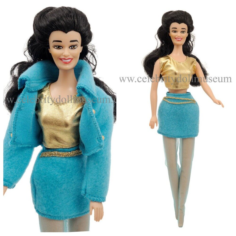 Один из вариантов аутфита: кукла одета в бирюзовый эластичный фетровый костюм-двойку с золотыми пуговицами и поясом. Под ним золотистый топ без рукавов и мешковатые бирюзовые нейлоновые чулки. Аксессуары включают бирюзовые туфли на высоком каблуке, белый махровый халат с золотой отделкой и розовую кисточку.