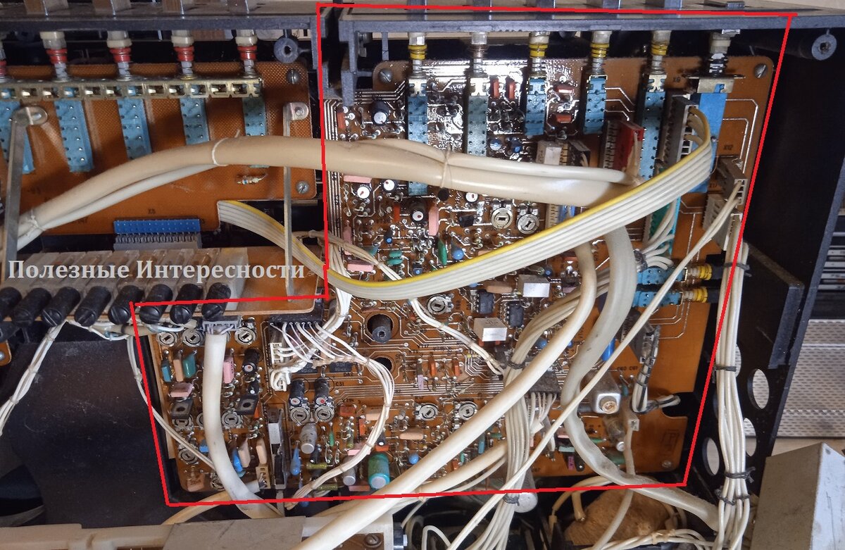 После восстановления модуля усилителя низкой частоты попробовал запустить магнитофон. Один канал практически было не слышно, а на втором звук очень искаженный, но и плюс фон по обоим каналам. Стало ясно, что надо основательно проверить усилитель воспроизведения магнитофона, который у "Арго" совмещен с шумоподавителем и с расширителем стереобазы. Выглядит магнитофонная плата внутри корпуса так: