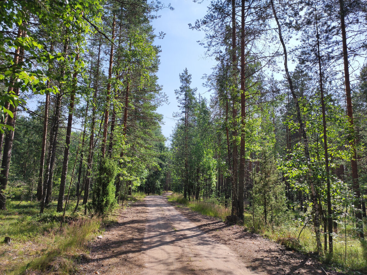 Разведывательный маршрут мне настолько понравился, что недолго думая я созвала знакомых, чтобы показать увиденные красивые места. Начало похода было прежним: сначала доехали до ж/д Рощино, после на автобусе 125. Но не до конечной остановки, вышли чуть раньше. Местность уже узнавалась. Мы шли, наблюдая за бабочками, стрекозами, сопровождающими нас, и поедали землянику. Опять пришли на озеро Чёрное в надежде искупаться. Это была моя ошибка, не рассмотрела хорошенько в прошлый раз, что берега илистые, заболоченные. Подходящего захода в воду не нашли. Дальше идём на двойные озёра на Болоте Каксламменсуо. Только путь к ним выбрали иначе. Новая (для меня) дорога оказалась ничуть не хуже. И грибочки попались по пути. Их то мы и сварим на обед. На болотных озёрах искупались, и посвежевшие отправились дальше. После небольшой возвышенности идём по тропе вдоль болота. Тропинка загляденье и место живописнейшее. На полянке нашлись ещё лисички. Тоже пойдут в суп. Вот озеро, к которому мы так и не