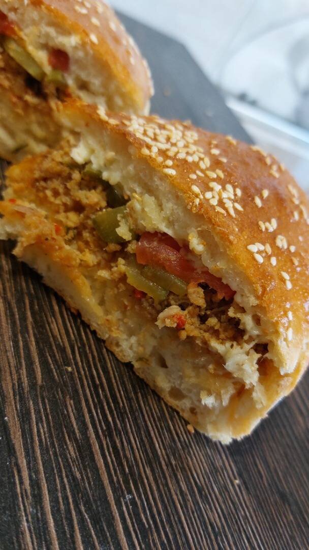 #закрытаяпицца Ингредиенты: Тесто: , молоко, дрожжи, сахар, соль, подсол.масло, мука, Фарш: , говядина, лук, зелень, томат, соль, перец, кориандр, Начинка: , фарш, кетчуп, маринов. огурцы, сыр, помидоры Способ приготовления: Замесить тесто, оставить на 1-2 часа для поднятия. Приготовить фарш, обжарить на слив масле с луком, томатом и специями. Далее тесто разделить на 2 части. Выложить в форму, сверху начинку, затем закрыть второй половиной теста, смешать яйцом и отправить в духовку при 180° до готовности.
